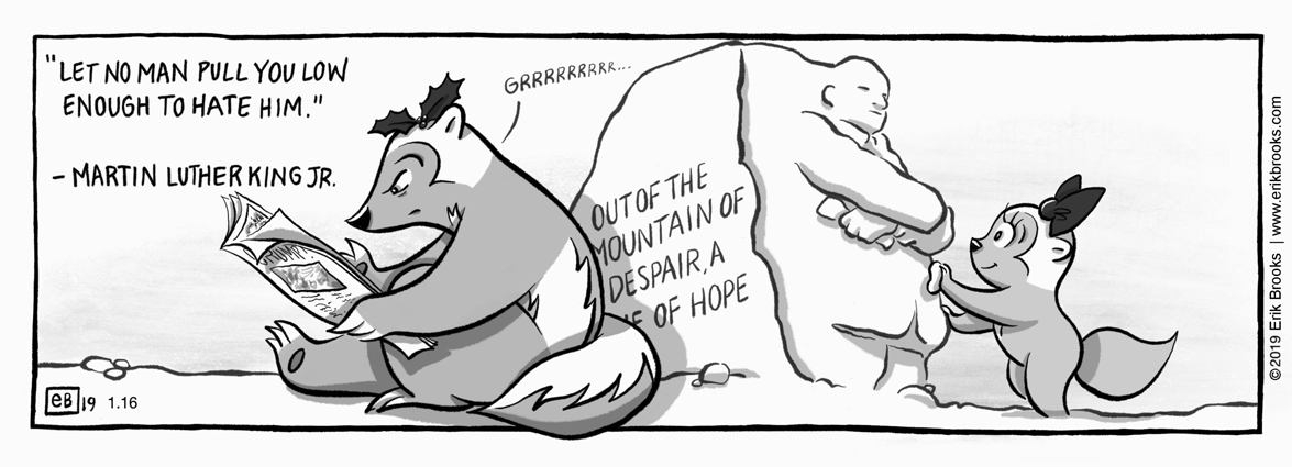 Reading something over the weekend before the strip about porcupines. Thought that there might be also something to their prickly nature that prevents them from denning together (except in extreme circumstances) but also just like the idea that they might be a little self-conscious. An extended streak of single-digit and low-teen degree temps here in the ever lovely Methow Valley. Any hope of that (going on 3+ weeks now) doing some damage control on the pine bark beetle infestations? Natural history and all of its wonders!